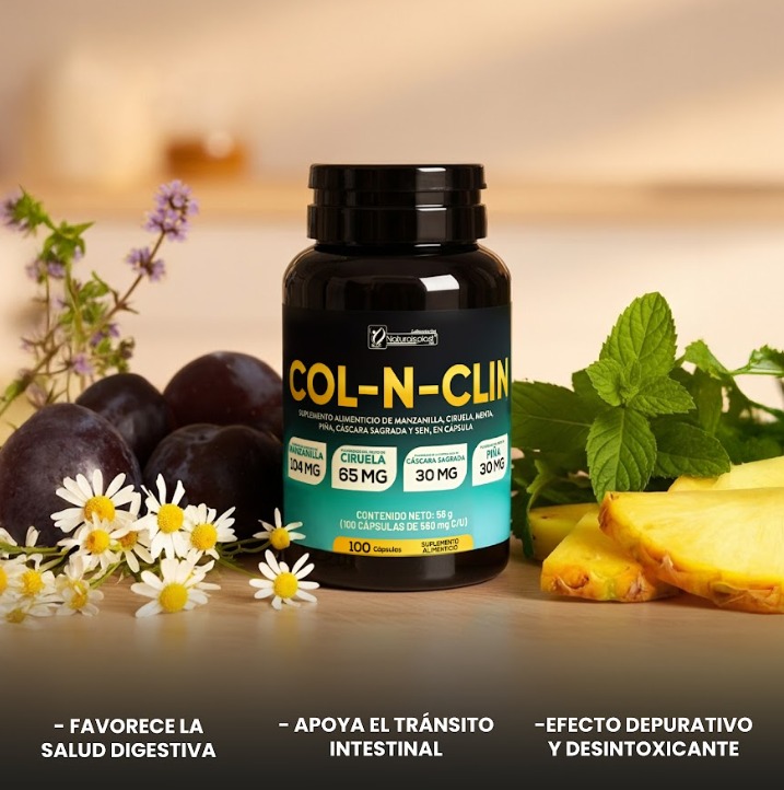 COL-NCLIN es un suplemento alimenticio en cápsulas formulado con una combinación natural de manzanilla, ciruela, menta, piña, cáscara sagrada y sen. Ideal para promover un tránsito intestinal saludable, aliviar molestias digestivas y apoyar una limpieza natural del organismo.